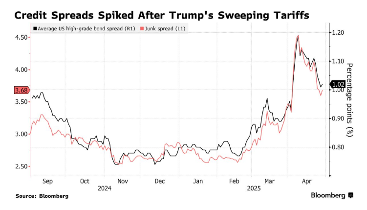 在4月2日关税公告发布后的几天里,美国和欧洲公司债券市场的风险指标飙升至自2023年3月地区银行业危机以及瑞士信贷倒闭以来的最高水平。投资者持有全球垃圾债券所要求的高于政府债券的额外收益率在自2020年3月以来最严重的抛售中大幅上升。