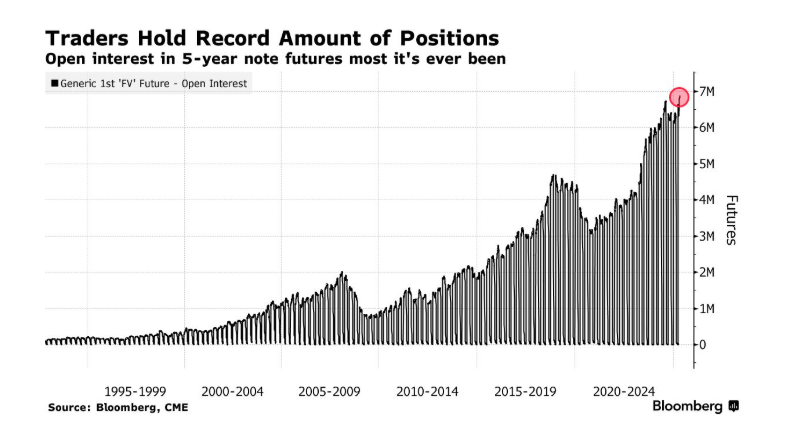 在美国国债期货市场,未平仓合约(即未结算合约总数)在最近几个交易日大幅上升,此前特朗普的关税声明曾引发了抛售。在5年期国债中,未平仓合约已攀升至自上世纪90年代初首次收集数据以来的最高水平。