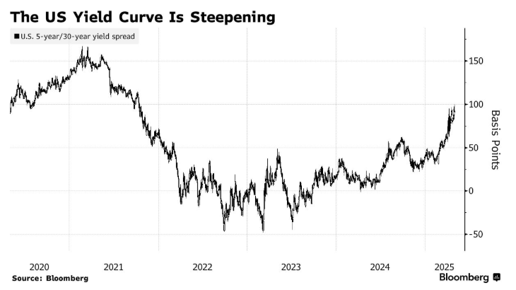美国经济的疲软迹象推动本月短期美债上涨,导致美债收益率曲线趋陡。4月两年期与五年期美债收益率超过30年期美债,创下2023年初以来最大差距。