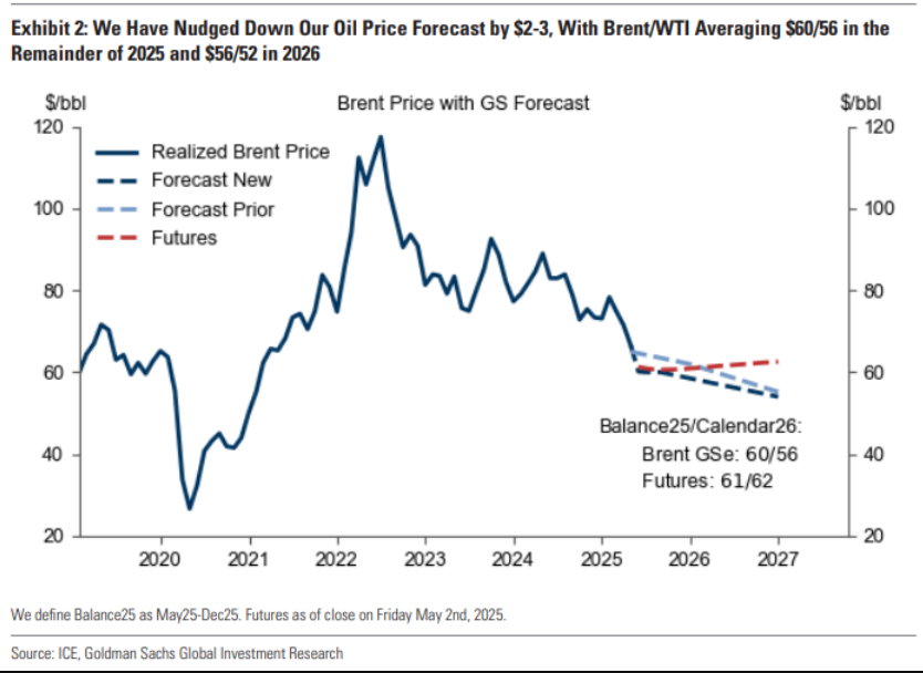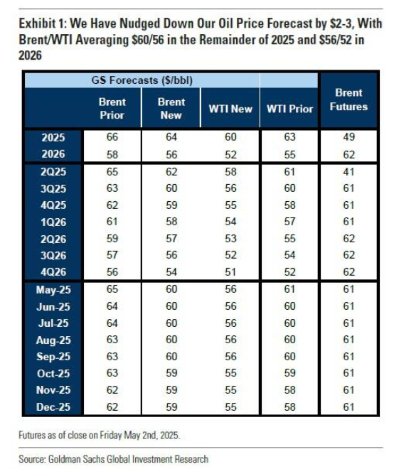 高盛的分析师现在预计,布伦特原油今年的平均价格为每桶60美元,低于此前预测的每桶63美元;美国基准WTI原油在2025年的平均价格下调至56美元,低于此前预期的每桶59美元。