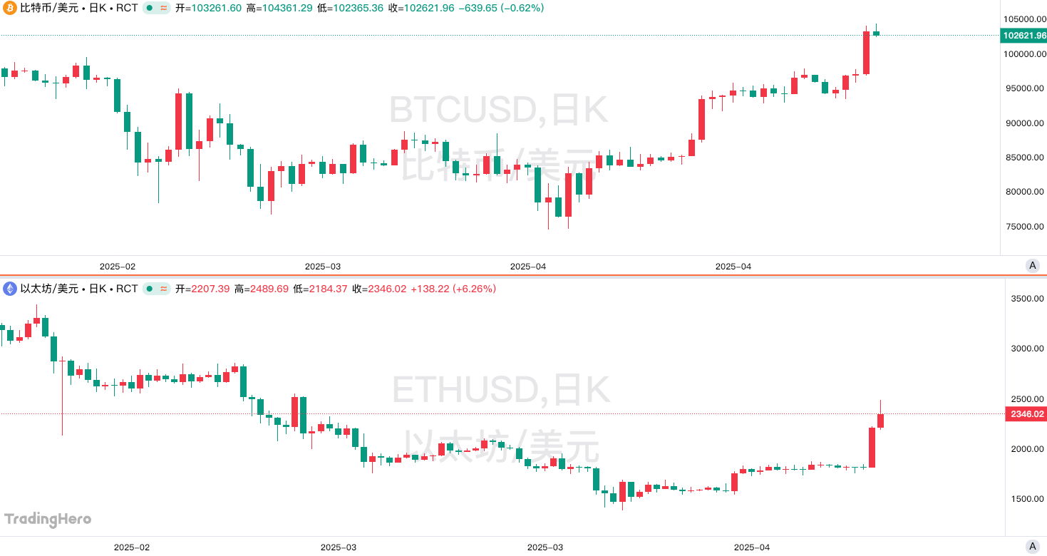 受美国贸易紧张局势缓等消息提振,比特币周三、周四连续上涨,重回10万美元上方;第二大代币以太坊在周五一度逼近2500美元。