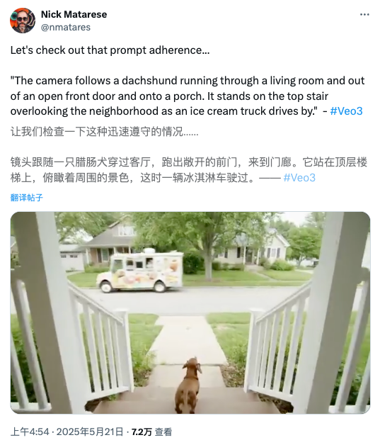 目前,X社交平台上已经涌现大量用户“尝鲜”的视频。比如,镜头跟随一只腊肠犬穿过客厅,跑出敞开的前门,来到门廊。它站在顶层楼梯上,俯瞰着周围的景色,这时一辆冰淇淋车驶过。视频中伴随小狗冲出门口的的脚步声、冰淇淋车驶过的声音。