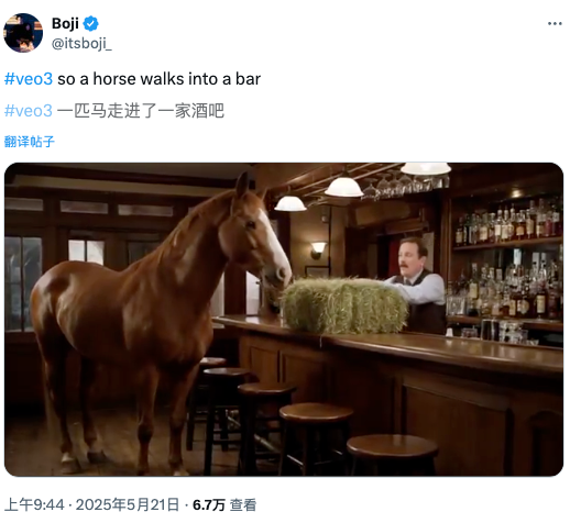在X用户分享的另一个Veo3生成的视频中,一匹马走进酒吧,视频伴随马蹄声、马叫声以及酒保说话的声音。