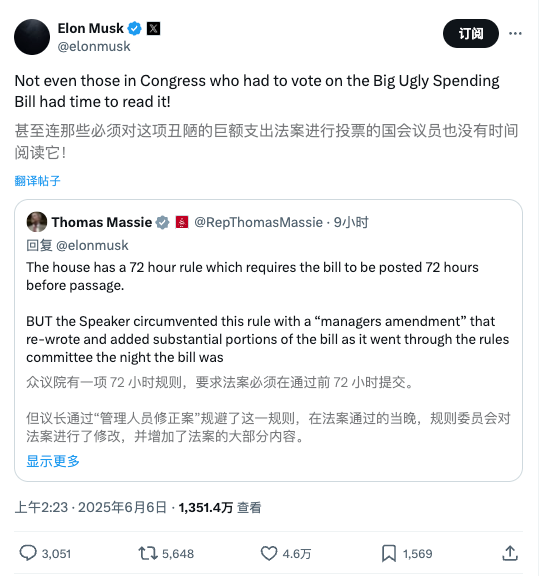 马斯克给特朗普的“美丽大法案”起了个新名字:“大丑陋支出法案”。