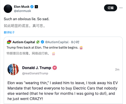马斯克回应特朗普的Truth Social帖子,称其是“赤裸裸的谎言,真可悲”。