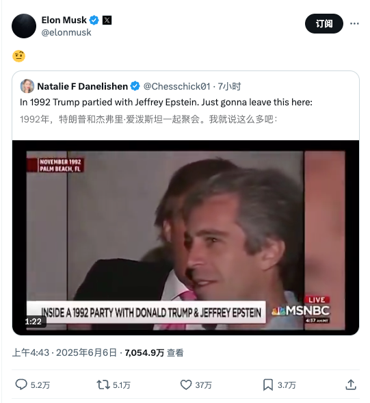 马斯克转发了一段上世纪90年代特朗普与爱泼斯坦(Jeffrey Epstein)聚会的视频,进一步佐证自己此前对爱泼斯坦档案的评论。