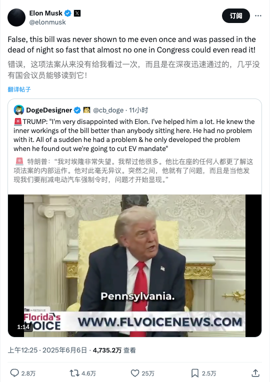 “完全是假的,这项法案根本没给我看过一次,而且是在深夜匆匆通过,几乎没有哪位国会议员来得及看清内容!”马斯克在X上写道。