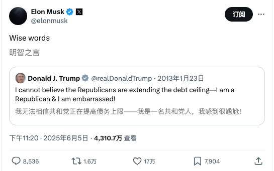 马斯克周二在X上发文称:“为这项法案投票的人真丢脸。”其实他所指是国会中投票支持特朗普税改法案的议员。