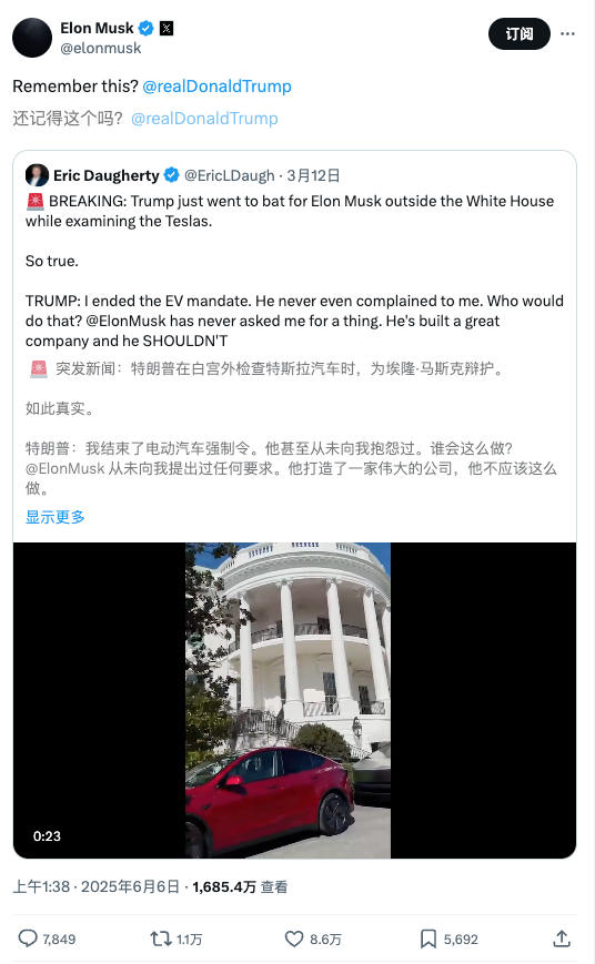 “埃隆已经‘让人受够了’,我让他走人,我撤掉了电动车强制采购令——就是那个强迫所有人买没人要的电动车的政策(他几个月前就知道我要这么干!)结果他就疯了!”特朗普写道。