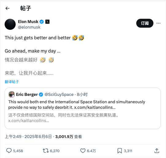 一分钟后,马斯克似乎在挑衅特朗普,说“这真是越来越精彩了,来吧,让我快活快活”。
