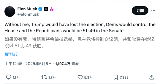 马斯克接着发布了一系列针对特朗普本人的言论,不再仅限于法案内容,甚至表示如果没有他,共和党根本赢不了。