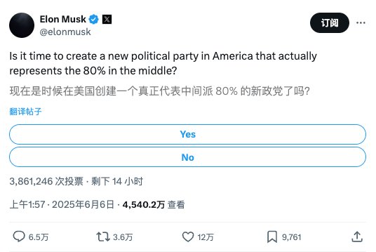 马斯克在X上发起投票,征询是否应建立一个“真正代表中间80%群体”的新政党。亿万富翁马克·库班(Mark Cuban)转发并连打三个对勾。