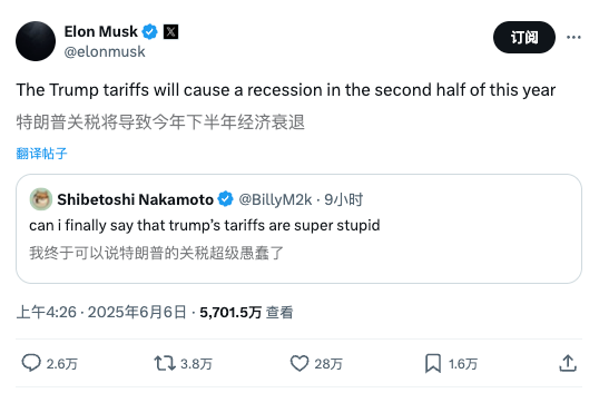 马斯克表示,特朗普的关税政策将“在今年下半年引发经济衰退”。