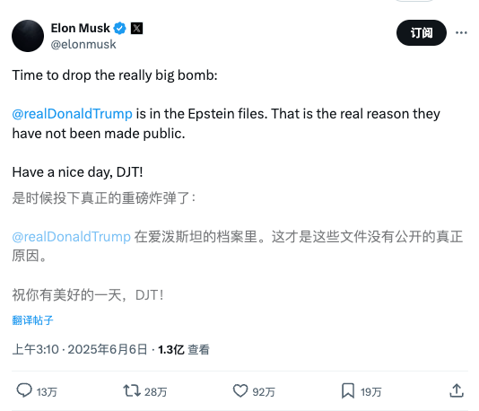 马斯克再次发出指控,说特朗普之所以没有公开爱泼斯坦档案,是因为他本人就在档案里面。