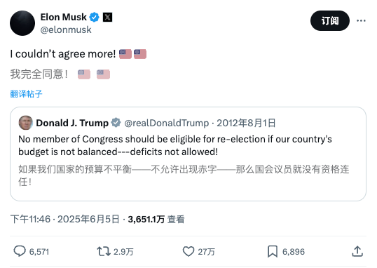 马斯克又挖出一条特朗普在2012年7月的旧帖,似乎是借此讽刺那项遭经济学家和国会预算办公室批评可能加剧赤字的新共和党税改法案。
