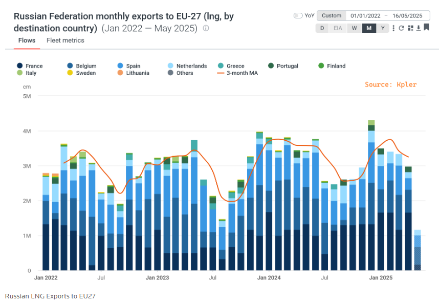 目前约19%的欧洲天然气仍来自俄罗斯(通过途经黑海的TurkStream管道和LNG运输),较2022年前的45%大幅下降。比利时、法国、荷兰和西班牙等国仍进口俄罗斯LNG。法国工业部长马克·费拉奇(Marc Ferracci)周一表示:“我们原则上完全支持该计划,旨在确保为企业找到最大安全保障的解决方案。”