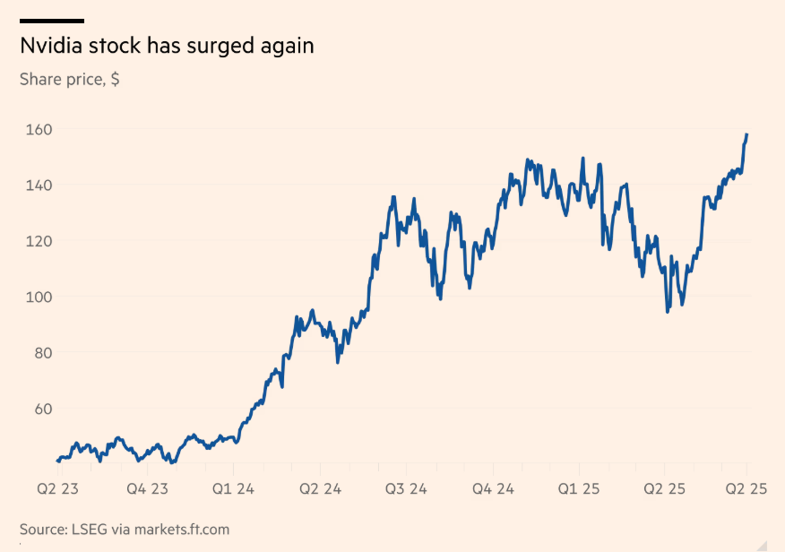 随着企业和国家向人工智能基础设施投入数十亿美元,英伟达的市值在几年内增长了四倍,达到3.8万亿美元。但英伟达股价在最近几周反弹之前,曾因中国初创人工智能公司DeepSeek的突破而受挫。自4月最低点以来,其市值已恢复约1.5万亿美元。