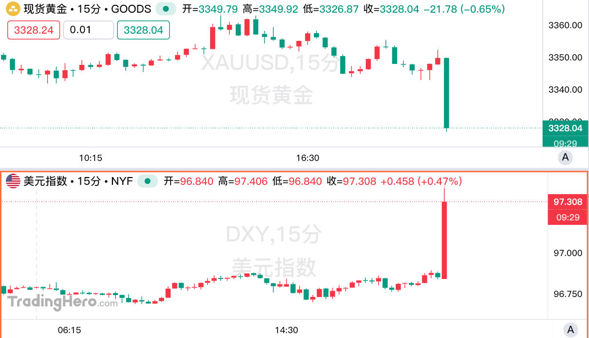 数据公布后,美元指数向上触及97,日内涨0.39%。现货黄金短线下挫19美元,下破3320美元/盎司。