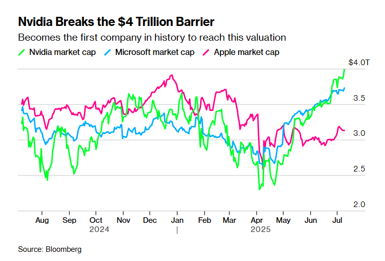 英伟达(NVDA)周三市值达到4万亿美元,成为全球首家市值达到这一里程碑的上市公司,巩固了其作为华尔街最受青睐股票之一的地位。