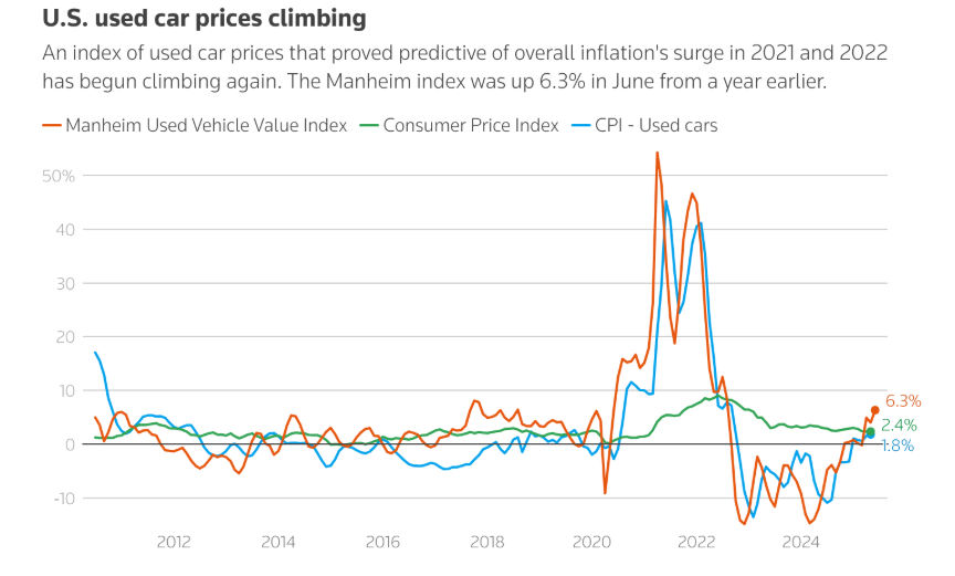 一项能预示通胀走势的美国二手车批发拍卖价格指数再度攀升,上月录得近三年最大年度涨幅。这一上涨源于特朗普实施的汽车关税引发的车辆价格与销量波动。