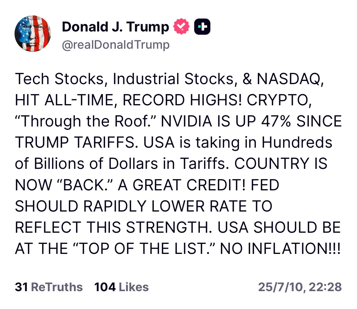 周四美盘,特朗普在社交媒体上吹嘘政绩,继续施压美联储降息。他写道:科技股、工业股、纳斯达克指数创历史新高!加密货币“涨破天花板”。自特朗普征收关税以来,英伟达股价上涨了47%。美国正在征收数千亿美元的关税。国家现在“回来了”。伟大的荣誉!美联储应该迅速降低利率以反映这种强势。美国应该排在“榜首”。没有通胀!!