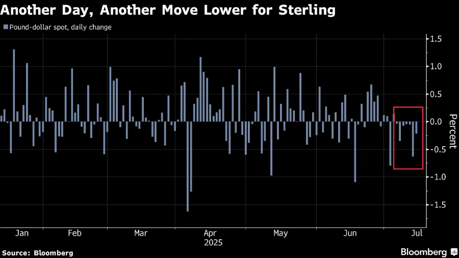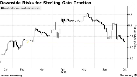 衡量看涨和看跌期权需求差异的一个月期风险逆转指标目前正反映出自2月份以来最负面的前景,该指标的时间跨度涵盖了下一次英国央行和美联储的决议,以及美国总统特朗普8月1日的关税最后谈判期限。