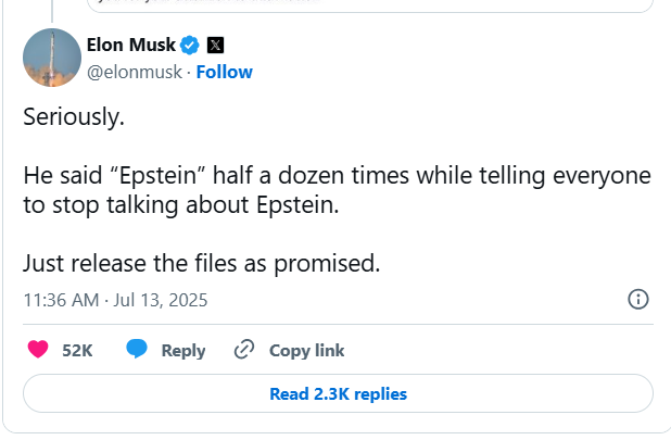 马斯克对此回应称:“他(特朗普)在让大家停止讨论爱泼斯坦的同时,自己却提了‘爱泼斯坦’六七次。”这位54岁的亿万富翁补充道:“赶紧按承诺公布文件吧。”