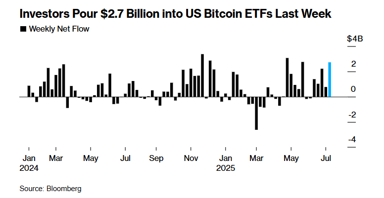 这某种程度上是一次反转。此前数月,由于投资者受贸易紧张局势困扰,昔日巨鲸纷纷抛售,比特币困于窄幅区间。但比特币支持者始终坚守,加密货币交易所交易基金(ETF)再度火爆,以迈克尔·塞勒(Michael Saylor)的Strategy公司为代表的企业,承诺购入数十亿美元比特币。