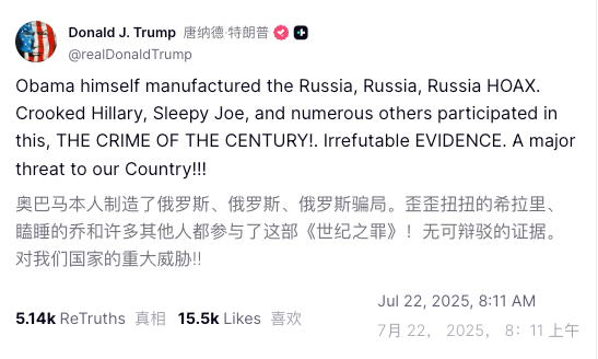 美国总统特朗普转发了一段显示前总统巴拉克·奥巴马(Barack Obama)在椭圆形办公室被捕的伪造视频。与此同时,特朗普政府官员持续指控奥巴马在2016年大选中试图损害特朗普的竞选活动,而特朗普本人则试图将话题从爱泼斯坦文件上转移开。