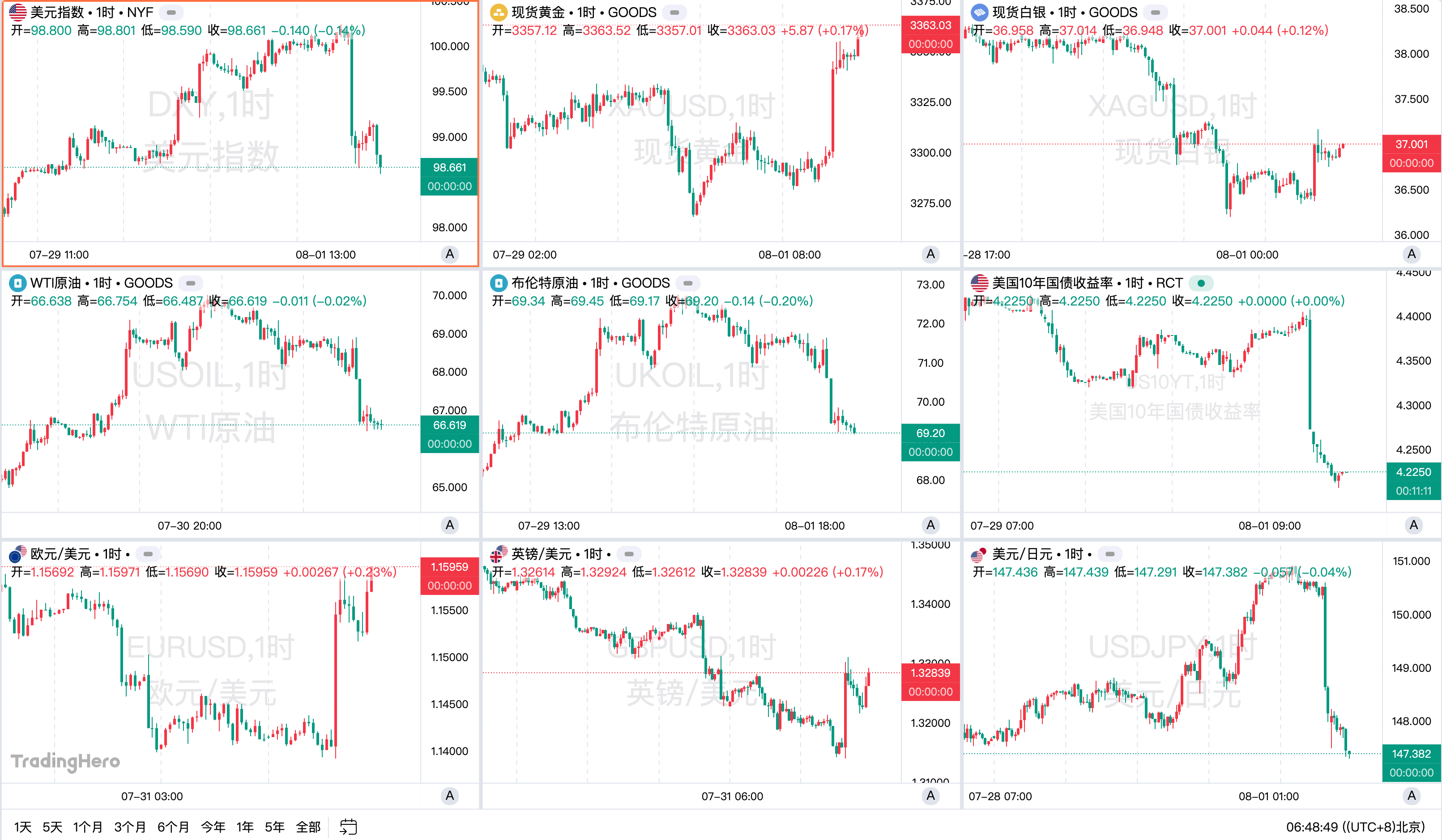 美元指数本周一度大幅上行,主要得益于美国与欧盟等达成贸易协议、好于预期的GDP等美国经济数据、美联储主席鲍威尔的新闻发布会被解读为鹰派,以及市场削减今年的降息预期。截至本周四,美指已经连续六个交易日收涨,并重回站上100整数关口,创5月底以来新高。但是,周五弱于预期的非农数据导致市场重新完全定价年内两次降息,美元重回99下方,15分钟内大幅下挫超过100点,本周收于98.66,涨幅收窄至1.03%。