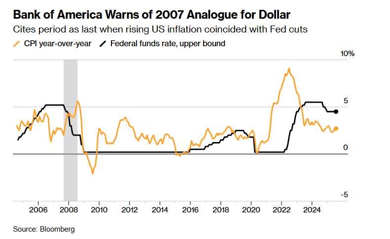美国银行称,美元将面临一种“致命组合”,即美联储在年化通胀率不断上升的情况下降低利率,这是一个近二十年前曾出现过的破坏性情景。