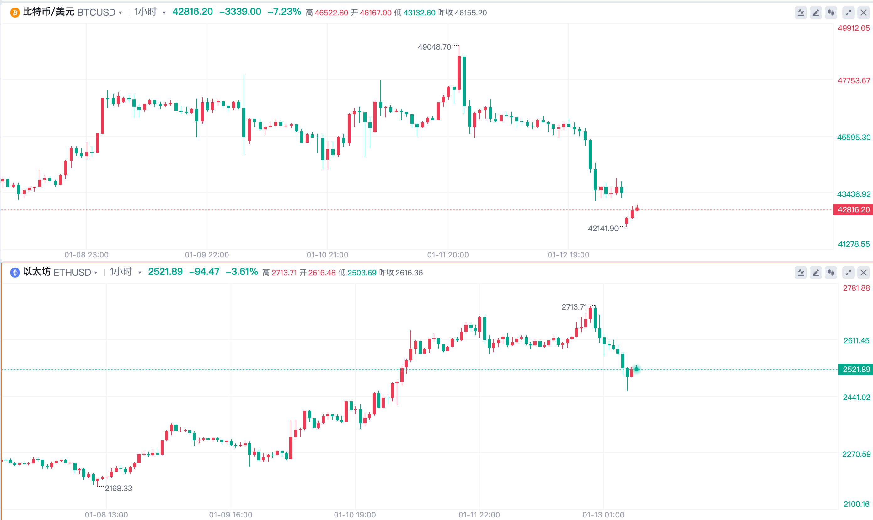 现货比特币ETF获批在美上市,带动比特币最高涨破4.9万美元/枚,但后续涨势乏力,周五美盘加速下跌至42142美元/枚附近;关于以太坊ETF的预期使该加密货币最高涨至2713.71美元,创2022年5月初以来最高。