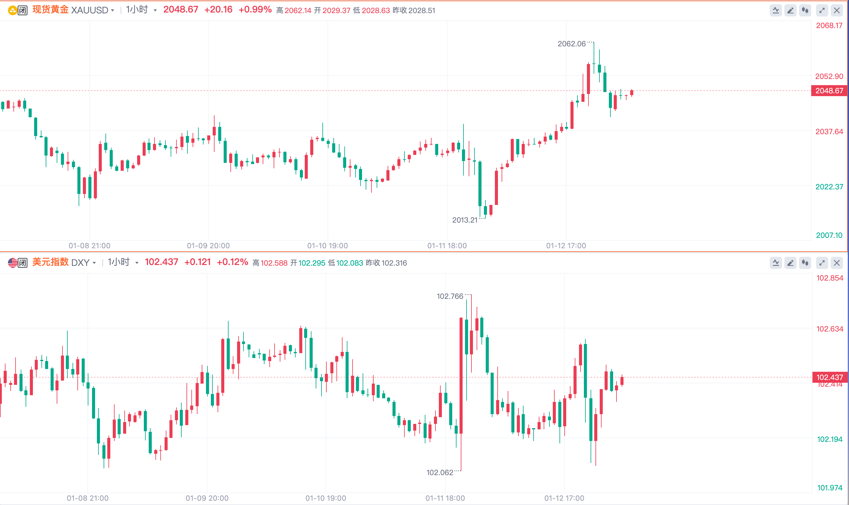 现货黄金本周整体呈震荡走高走势,在CPI超预期反弹的影响下触及2013.21美元/盎司的低点,随后受地缘因素和疲弱的PPI数据提振快速回升并涨破2060美元。美元指数周内同样表现震荡,通胀数据超出预期最初削弱了市场对美联储3月降息的押注,美指涨至一周高点102.77,但随后因降息预期再度回升而抹去全部涨幅。