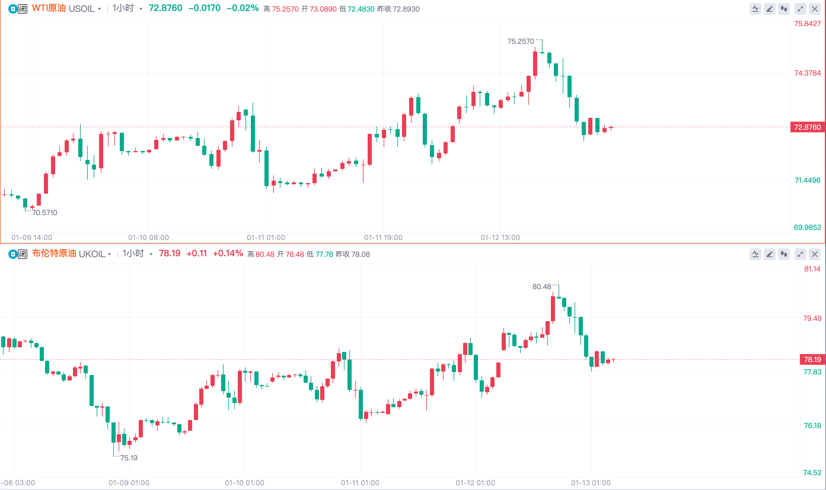 中东紧张局势升级,国际原油本周大幅走高。英美空袭也门后胡塞武装分子威胁报复,对原油供应的担忧助推布伦特原油再度站上80美元/桶,WTI原油重回75美元/桶。