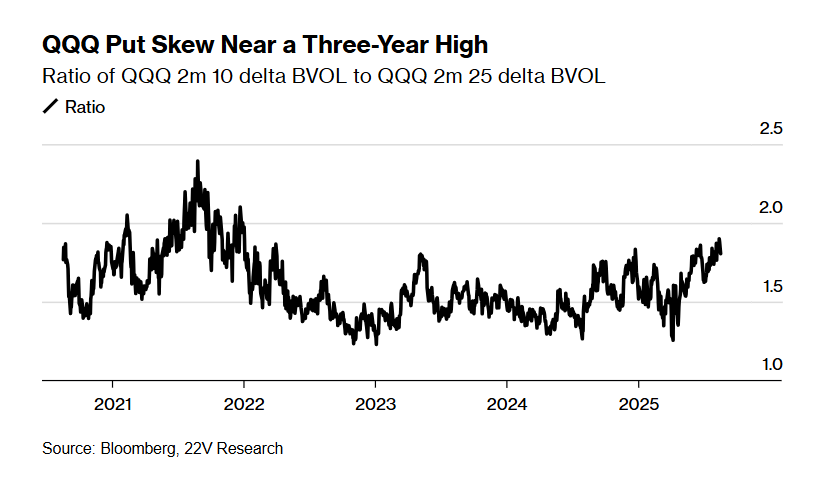 雅各布森称,交易者正在购买景顺QQQ信托系列1 ETF(QQQ)的“灾难性看跌期权”,该ETF追踪纳斯达克100指数。看跌期权赋予投资者以特定价格卖出标的证券的权利,是防范市场下跌的常用工具。他表示,衡量“防范大幅下跌”与“防范小幅下跌”的成本差异指标,已升至近三年高点。