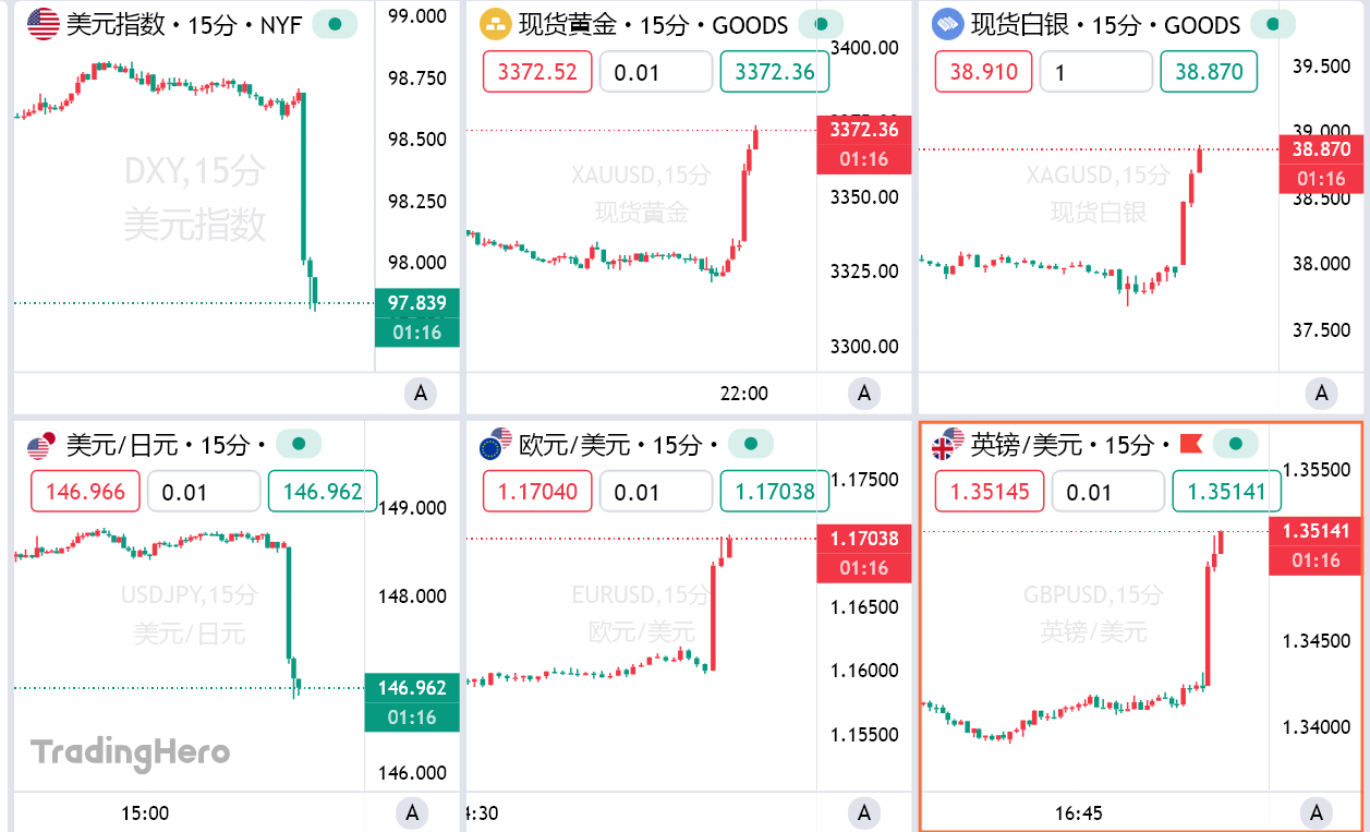 美元指数继续回落,跌至98下方,日内跌超0.7%。现货黄金突破3370美元/盎司,日内涨超1%。现货白银日内涨超2%,逼近39美元/盎司。