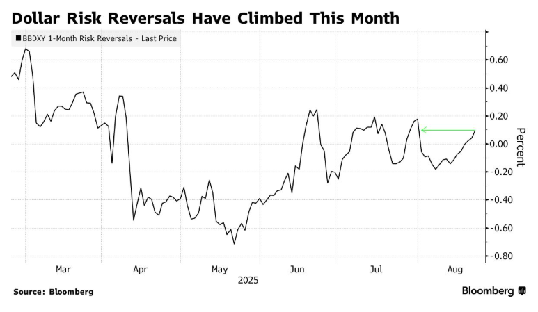 在鲍威尔周五于美联储年度杰克逊霍尔研讨会上发表备受期待的讲话前,彭博美元现货指数的所谓“一个月期风险逆转指标”已升至7月31日以来的最高水平。目前美元指数处于8月5日以来的高位,本周有望以接近0.8%的涨幅收官。