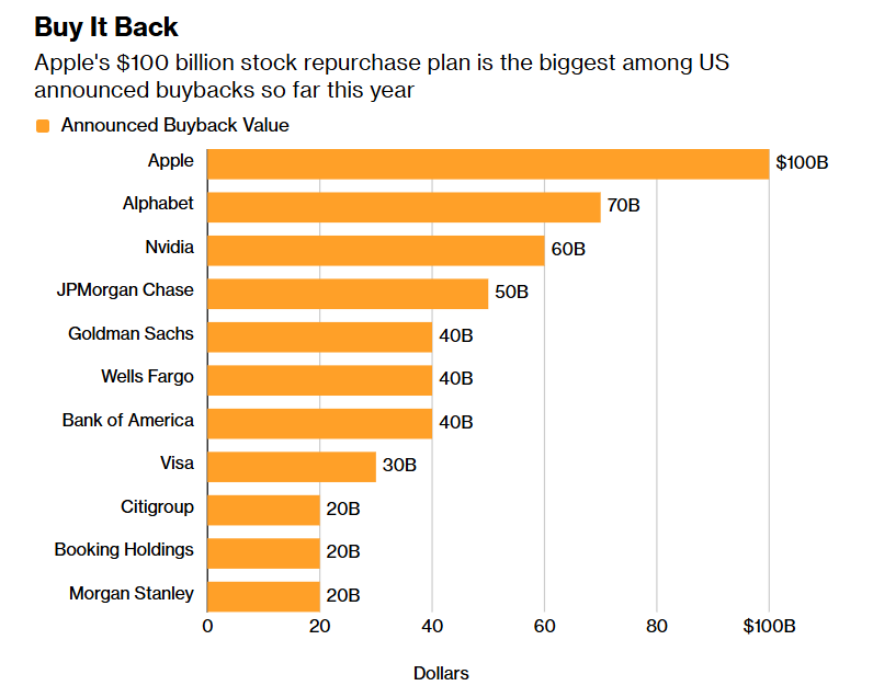 今年5月,苹果公司(AAPL)宣布将回购1000亿美元股票。Alphabet(GOOGL)、摩根大通(JPM)、高盛集团(GS)、富国银行(WFC)和美国银行(BAC)也宣布了至少400亿美元的回购计划。