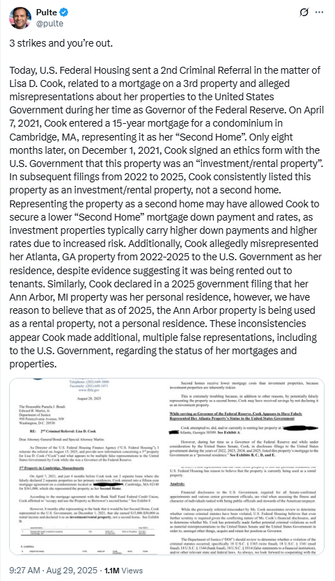 他的帖子包含了致司法部长帕姆·邦迪(Pam Bondi)和司法部高级官员埃德·马丁(Ed Martin)的信函图片,其中陈述了对库克的指控。