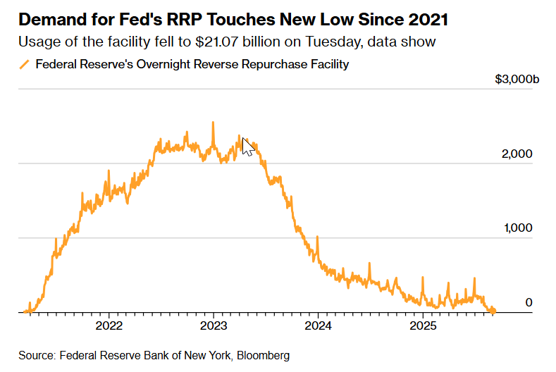 美联储密切关注RRP工具的使用情况,因其有助于判断市场中闲置资金的规模,同时也能帮助控制短期利率。目前该工具余额正趋近于零,随时可能降至零水平。