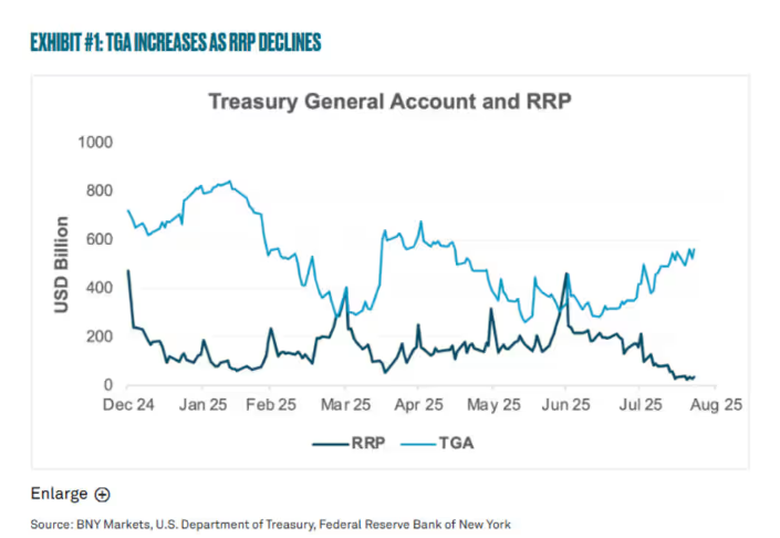 摩根大通由特雷莎·何(Teresa Ho)牵头的团队在8月报告中指出:“随着财政部一般账户(TGA)余额攀升,鉴于RRP余额已接近零,银行准备金正承担更多流动性流失压力;若TGA持续补充资金,可能为融资压力埋下伏笔。”