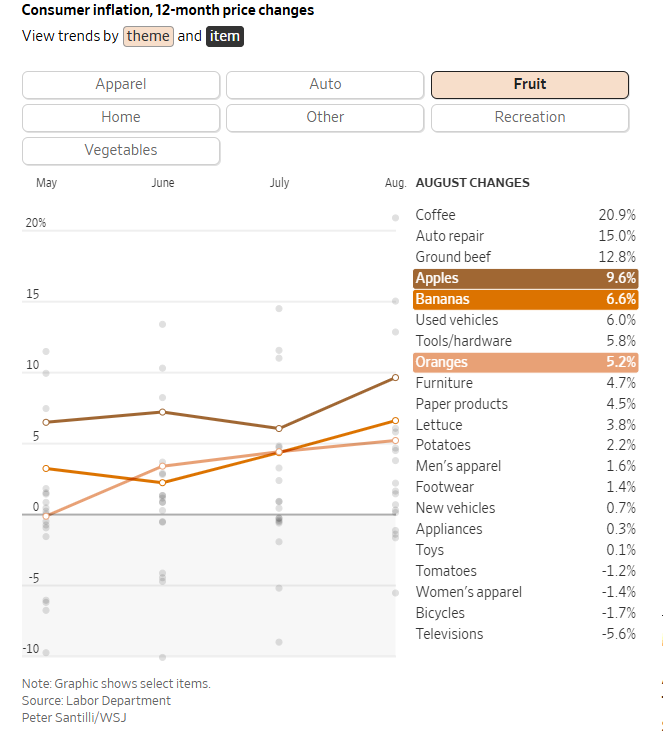 富国银行高级经济学家萨拉·豪斯(Sarah House)指出,关税成本并未一次性转嫁至消费者,但整体趋势仍指向商品价格上行。例如,8月杂货价格环比上涨0.6%,咖啡、生牛排和苹果同比涨幅分别达21%、17%和10%,直接冲击民生成本。
