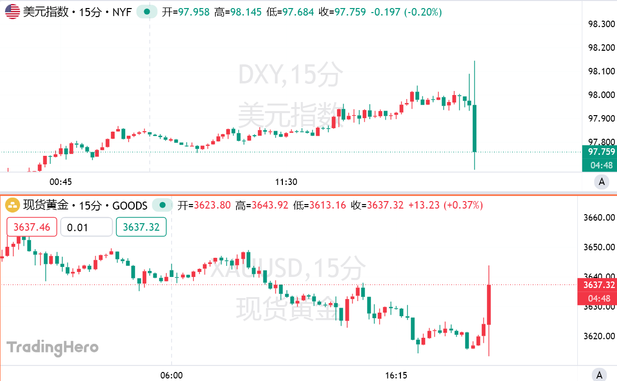 数据公布后,美元指数短线下挫30余点。现货黄金持续拉升,短线涨幅扩大至近30美元,一度重回3640美元/盎司上方。