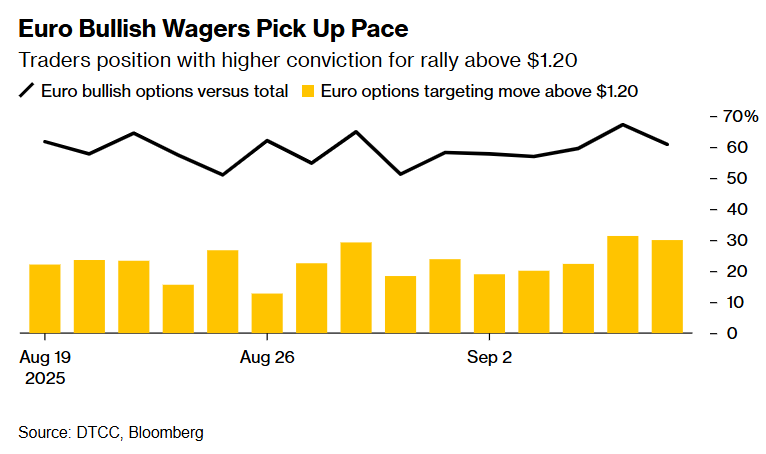这种政策分化在资金流动层面尤为明显:存托信托与清算公司(DTCC)的数据显示,自上周五以来,每三笔看涨欧元兑美元的押注中就有一笔目标直指1.20关口。