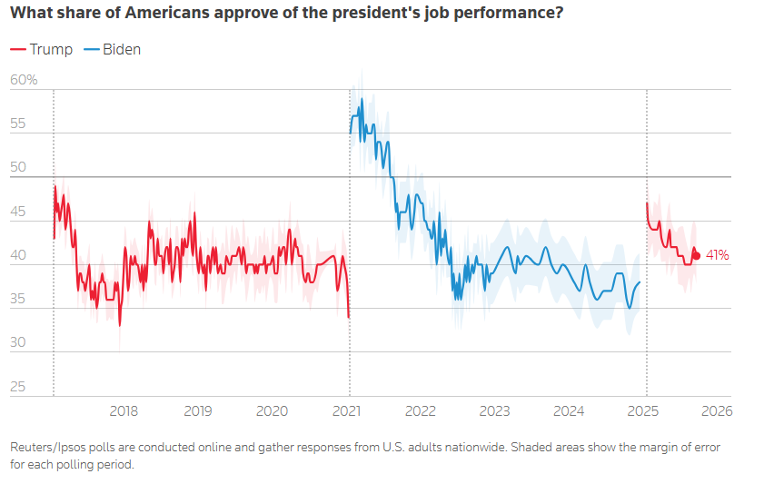 这项为期三天、于周日收官的民调显示,41%的受访者认可特朗普的总统履职表现,低于9月5日至9日民调中的42%。