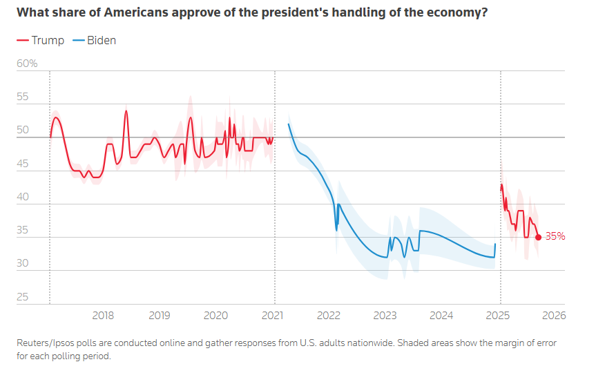 仅35%的受访者认可特朗普对经济的治理,28%的人对其应对生活成本问题的表现表示认可——这两项数据均略低于此前民调。特朗普去年竞选总统时曾承诺整顿经济。