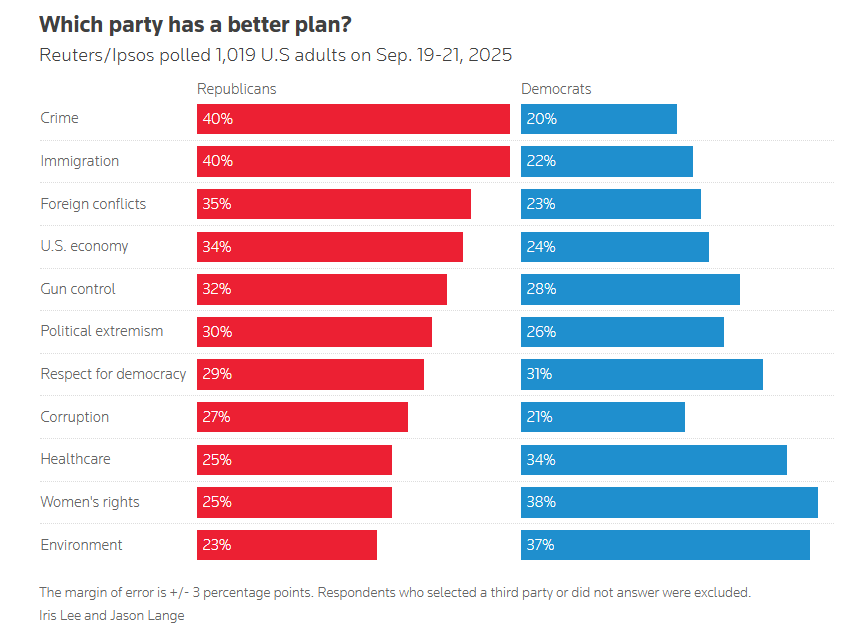 尽管经济问题拖累了特朗普的支持率,但在“经济政策治理”方面,受访者对共和党的支持率(34%)高于民主党(24%)。