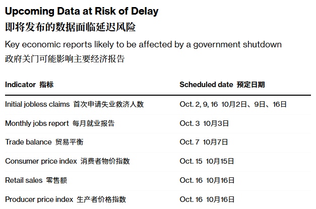 如果政府在9月30日之后关门,首当其冲的将是定于10月3日发布的劳工统计局就业报告。该机构关于通胀的重磅报告——消费者价格指数(CPI)将是日程表上下一个受影响的重要数据,而来自人口普查局的关于零售销售和新住宅建设的报告也面临被推迟的风险。
