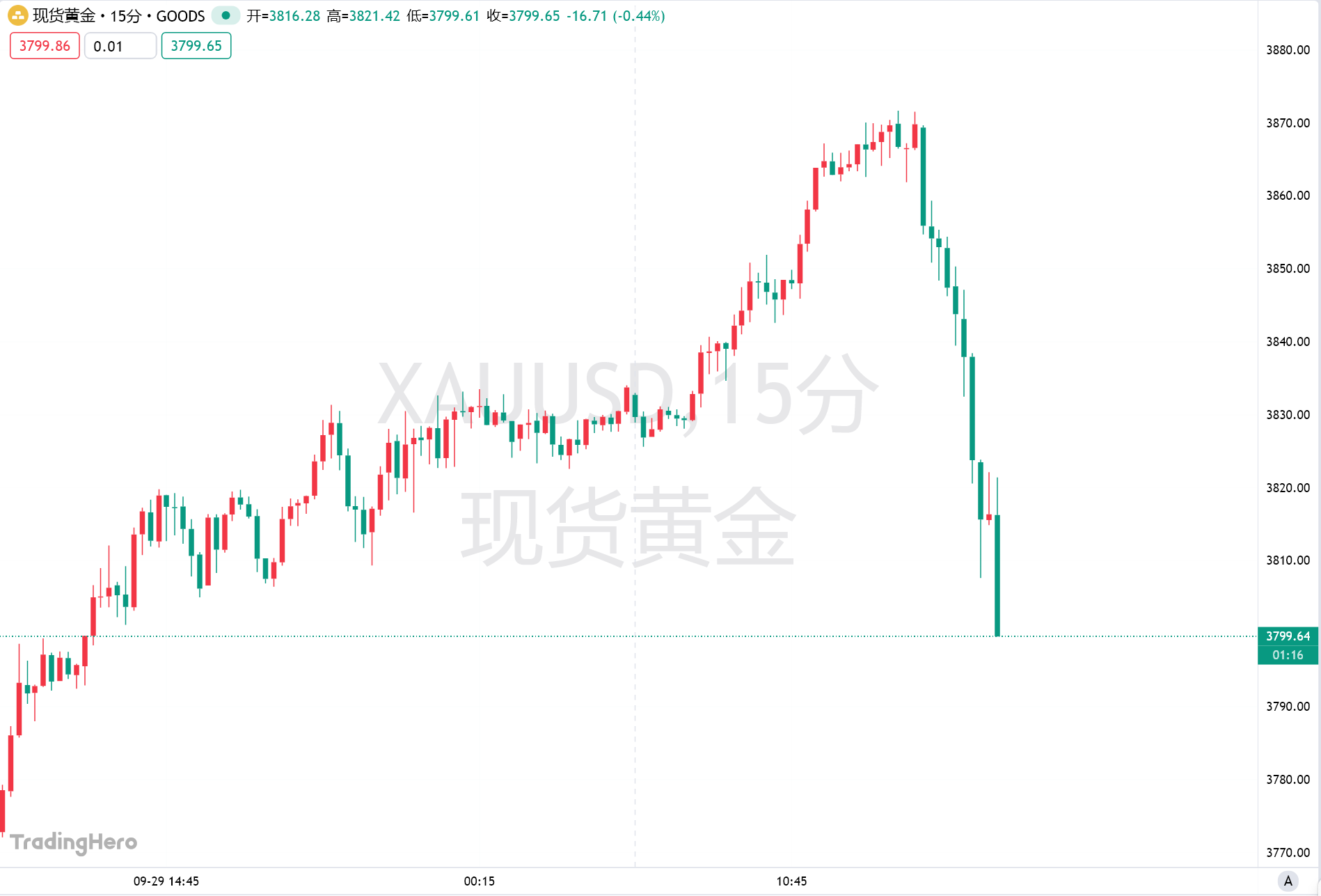 周二,由于投资者担心美国政府可能关门导致美元走弱,贵金属价格飙升。现货黄金一度将历史新高刷新至3870美元左右,随后因投资者获利了结持续下挫,回落至3800美元/盎司下方,较日高低70美元以上,日内跌近1%。