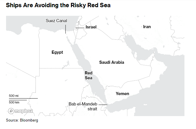 彭博的船舶跟踪数据显示,本月从沙特的拉斯塔努拉(Ras Tanura)和朱拜勒(Jubail)港口以及伊拉克的巴士拉(Basra)港口装载原油和成品油的船只已改变航线,驶离红海南部入口处的曼德海峡(Bab el-Mandeb strait)。